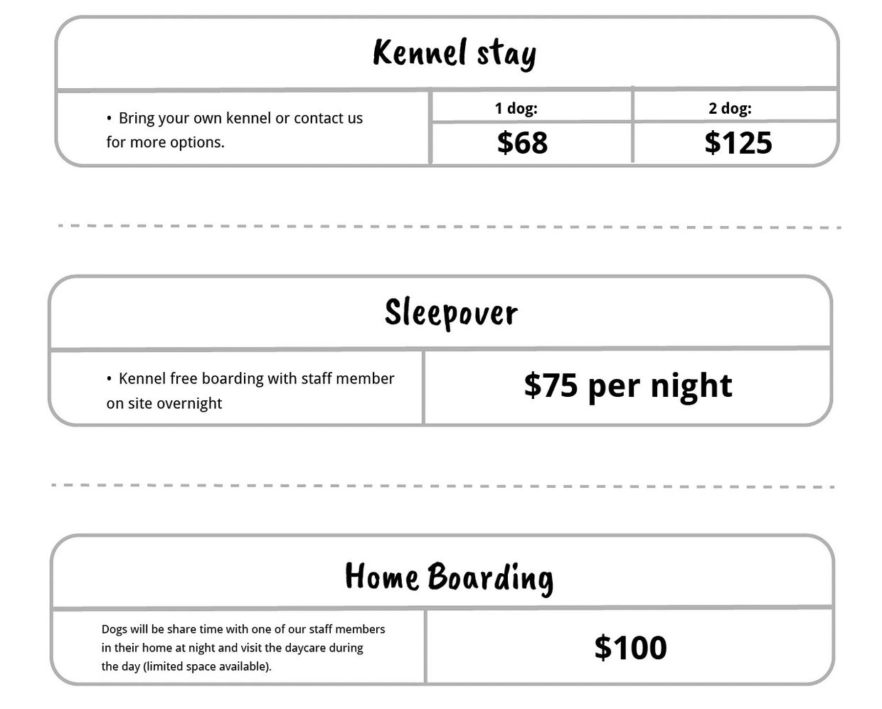 *Boarding guests must pass temperament test and spend at least 1 full day in daycare prior to start of overnight stay.